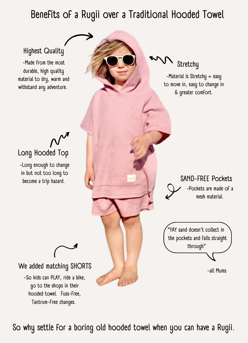 Amazing, innovative product. I Bought two of the Rugii hooded towel and shorts sets for my girls, aged 4 and 6. They love them and there’s no more fussing around trying f to find a change room at the crowded pool after swim lessons. Quick dry, then Easy on, keeps them warm and snug. Easy to wash and dry for next time. Great for beach as well. 10/10 highly recommend!