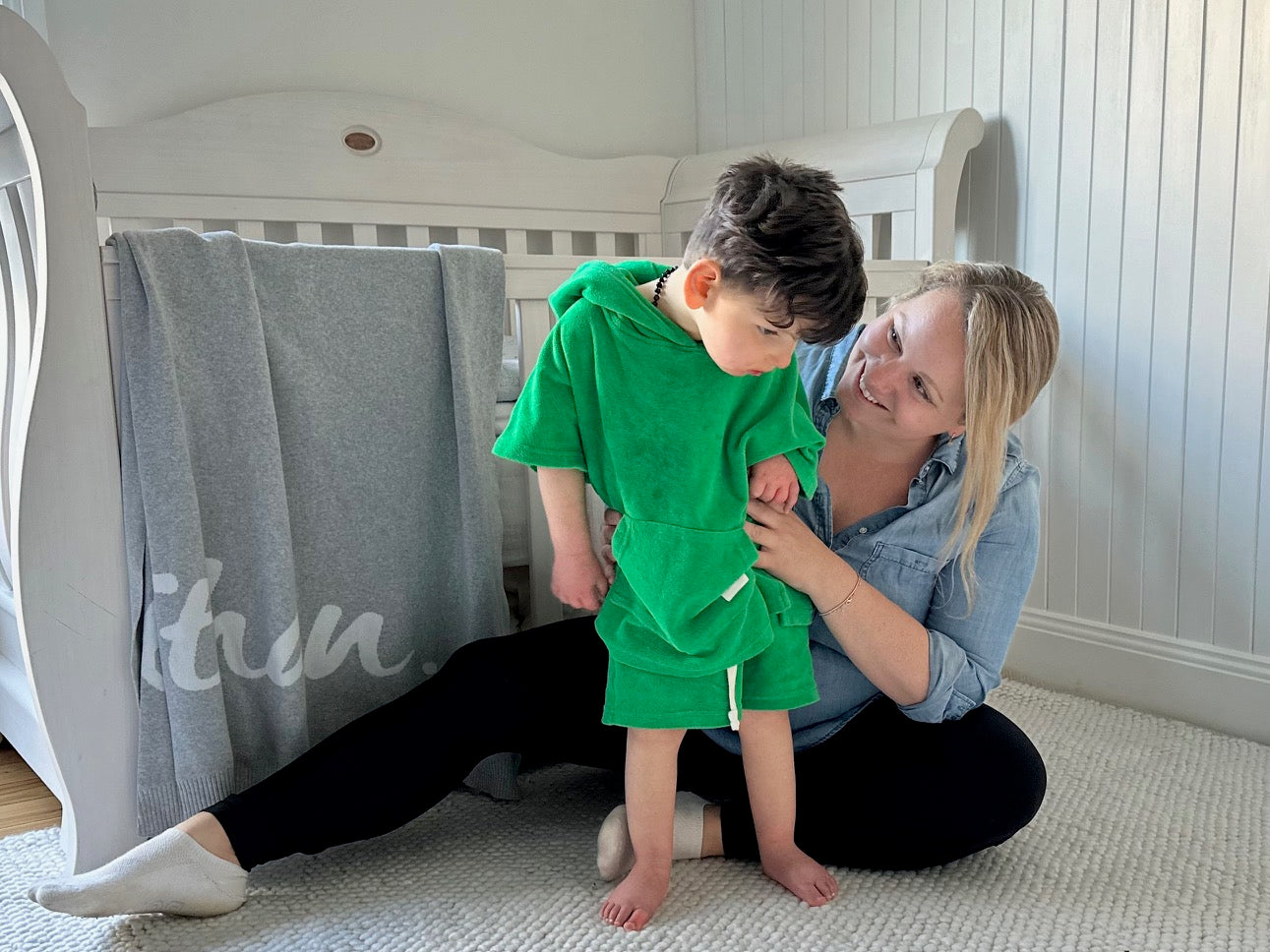 It was during these challenging seasons that the idea for the Rugii began to form. Nat imagined something that would make beach outings easier, warmer, and more enjoyable for her boys, an all-in-one outfit that kept them snug after a swim, allowed them the freedom to play, and looked beautifully stylish. From that vision, the Rugii came to life: a cleverly designed hooded towel outfit that blends practicality, comfort, and fun.